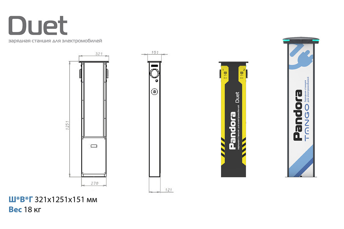 Pandora DUET L — двухпортовая AC-станция мощностью до 2×22 кВт, предназначенная для одновременной зарядки двух электромобилей без снижения эффективности. Поддержка протоколов OCPP 1.6 и 2.0.1 позволяет подключать станцию к операторским платформам, реализовывать коммерческий учёт и осуществлять удалённый мониторинг.