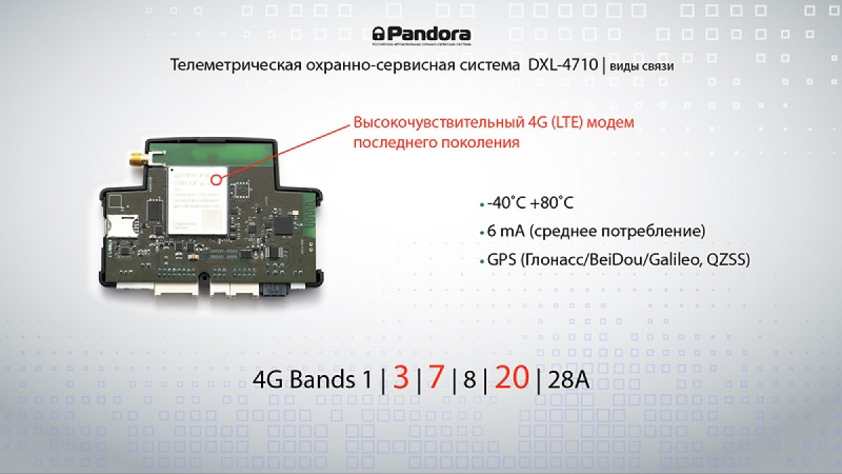 В Pandora DXL 4710 используется современный 4G/3G/2G GSM-модем последнего поколения, поддерживающий все доступные в России диапазоны и протоколы связи. Bluetooth-интерфейс создан на чипе NRF52840 и может похвастаться полноценной, оригинальной поддержкой всех протоколов Bluetooth 5.0.