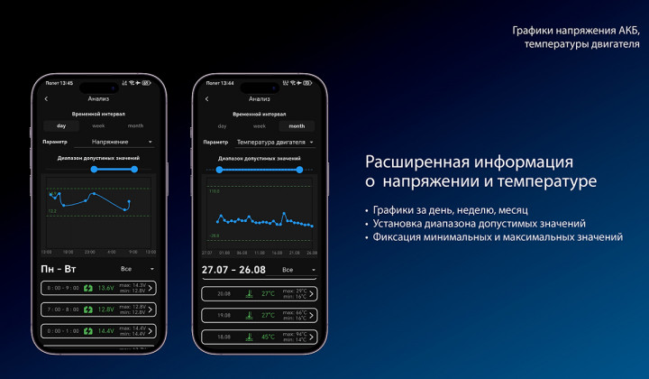 На расширенном экране также добавлена иконка «График анализ». Это расширенная информация по истории напряжения аккумуляторной батареи и температуры двигателя, позволяющая провести диагностику автомобиля на аномальные значения настраиваемых параметров за день, неделю, месяц.